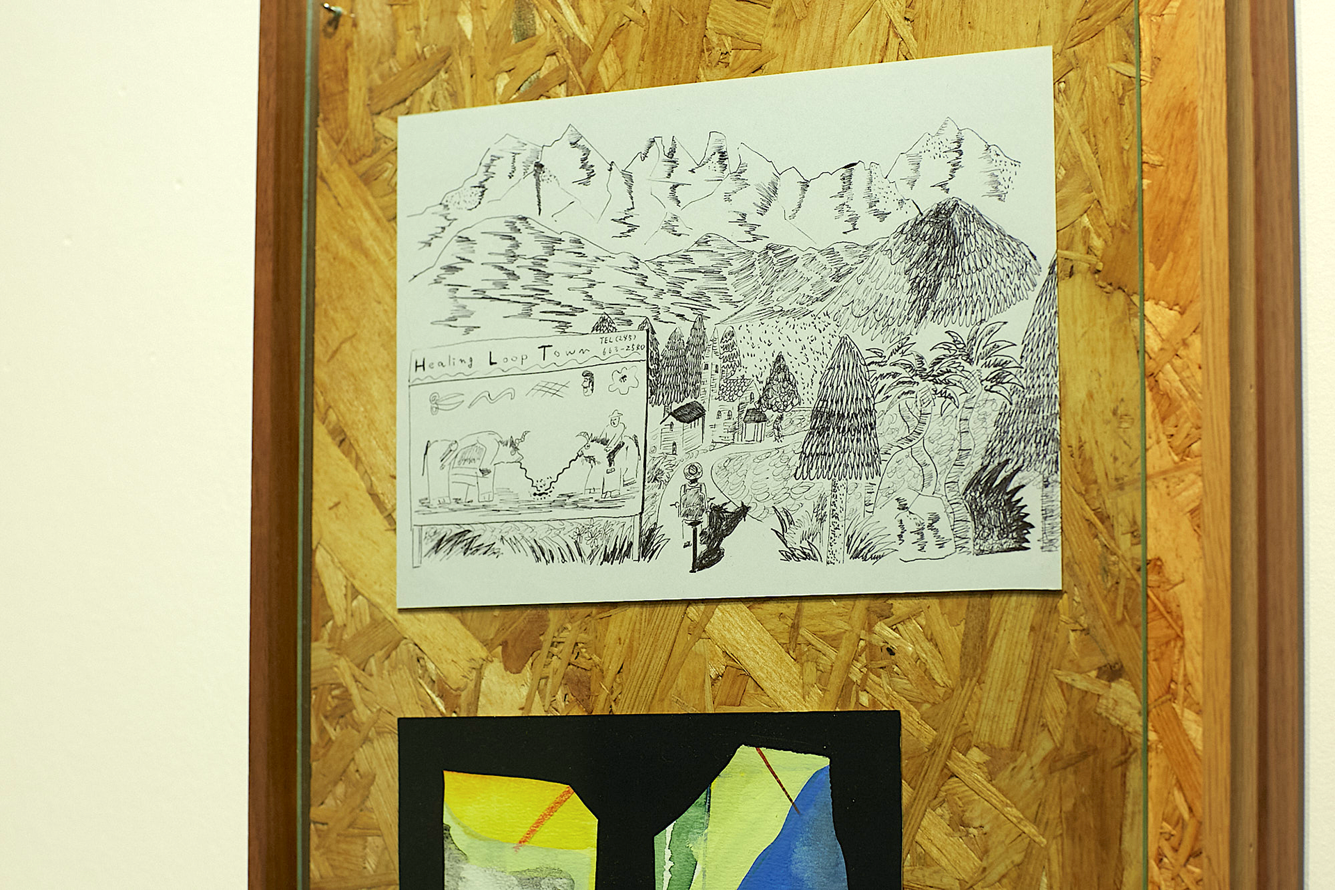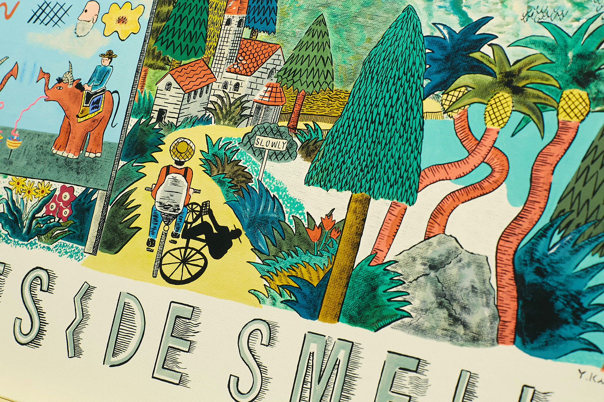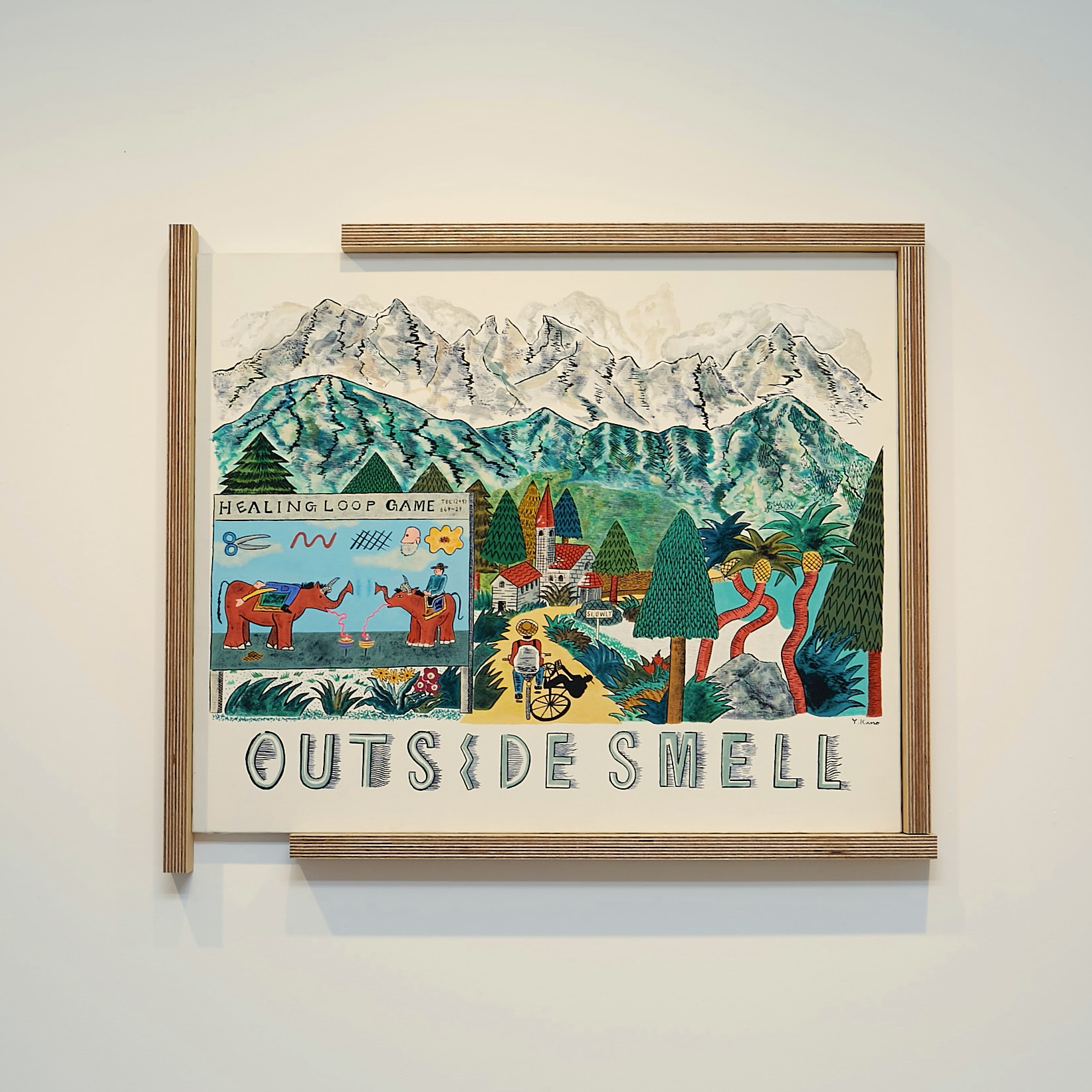 この展示の全体のテーマは、コロナ後の世界で生きる自分にとっての癒しとは外に出て感じる豊かな感情ではないかと考え、どこかの怪しい田舎の村に自転車で入る青年の小さな旅の物語の様なものを想像して絵を描いた。