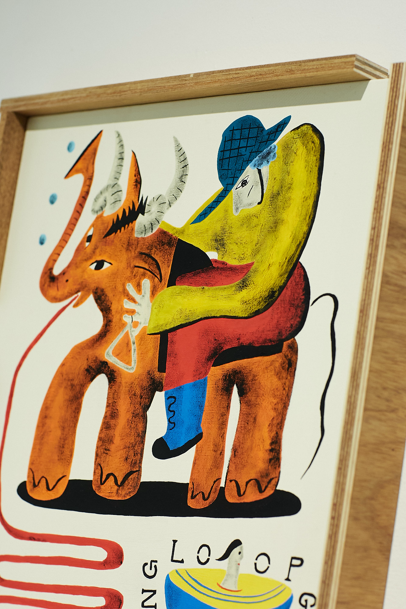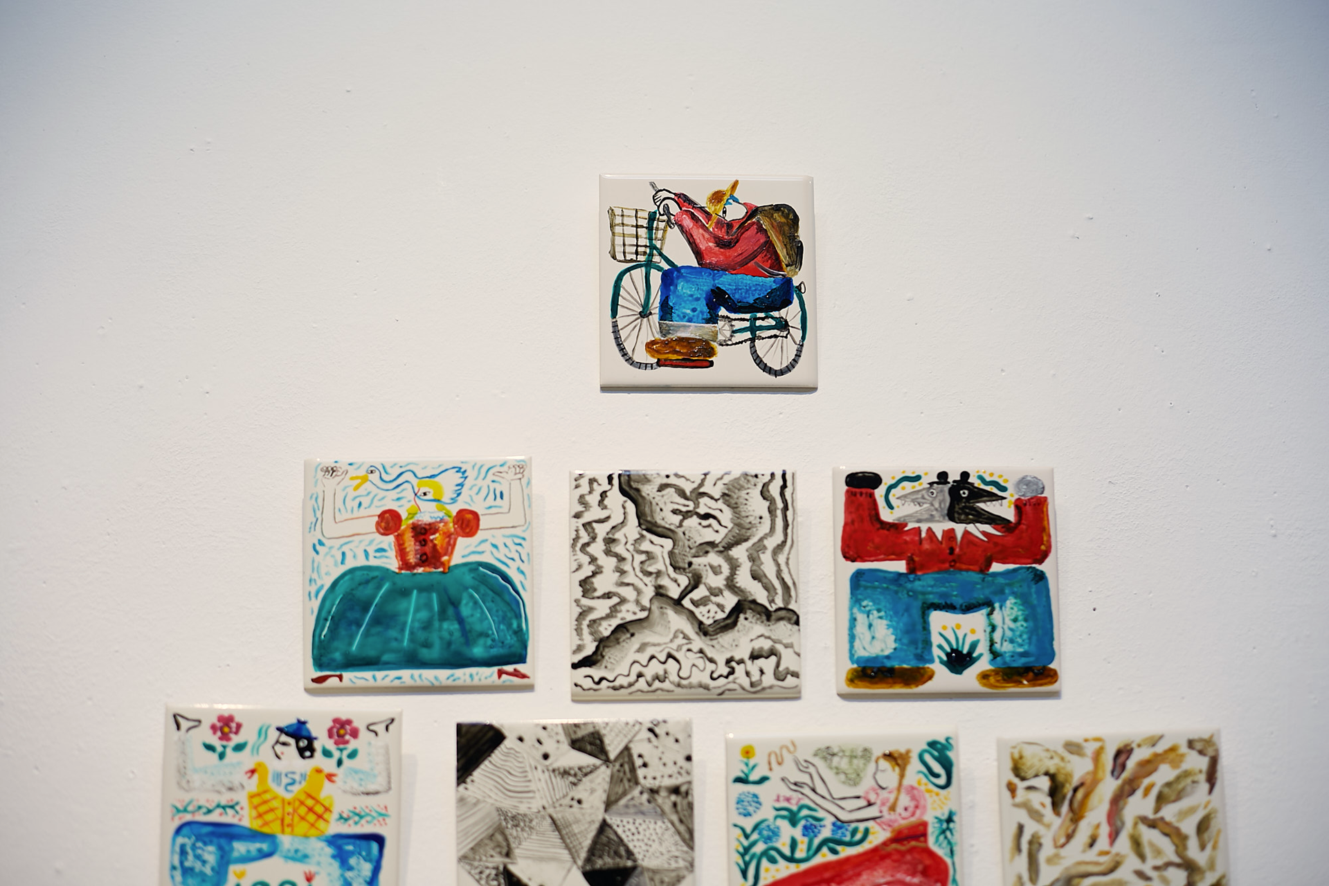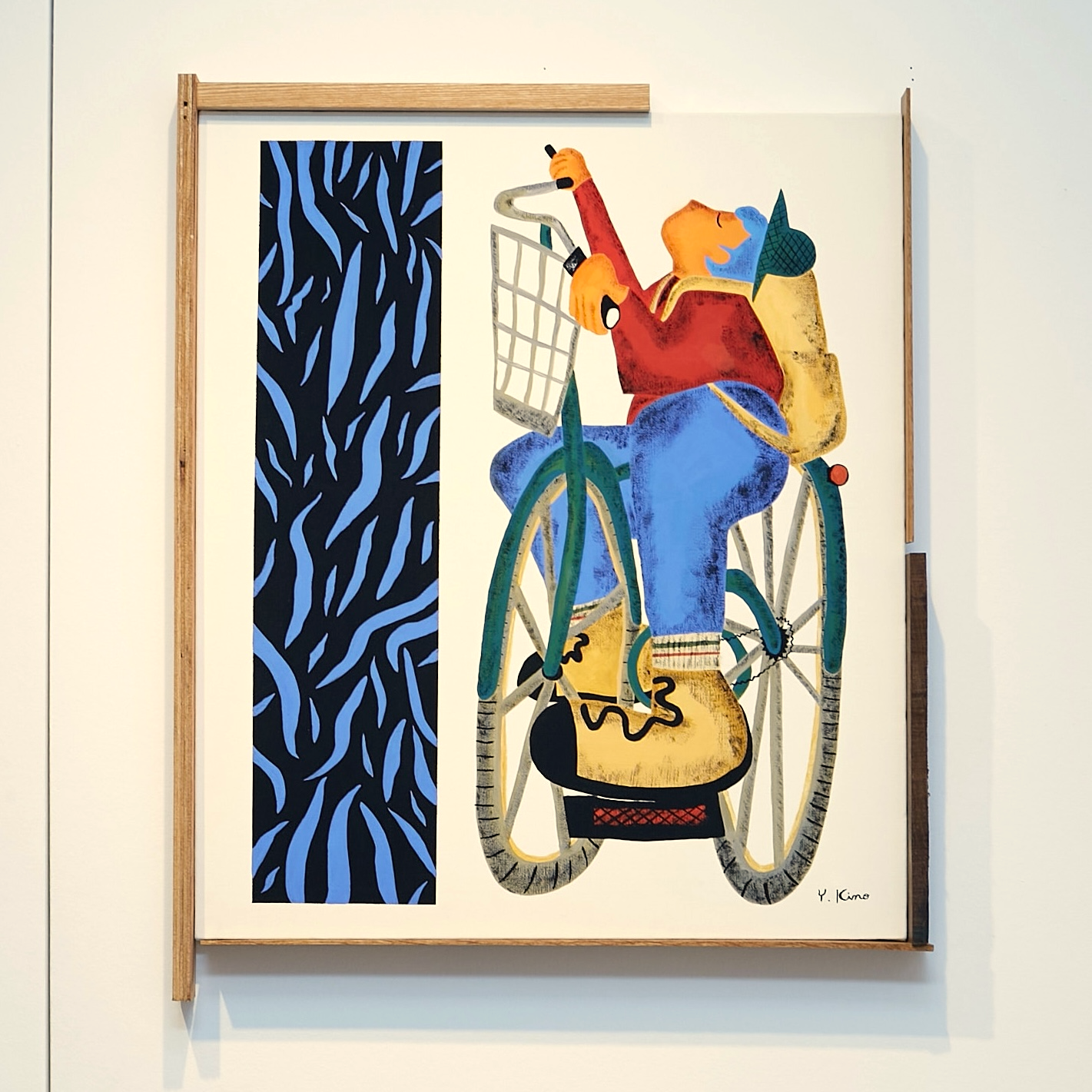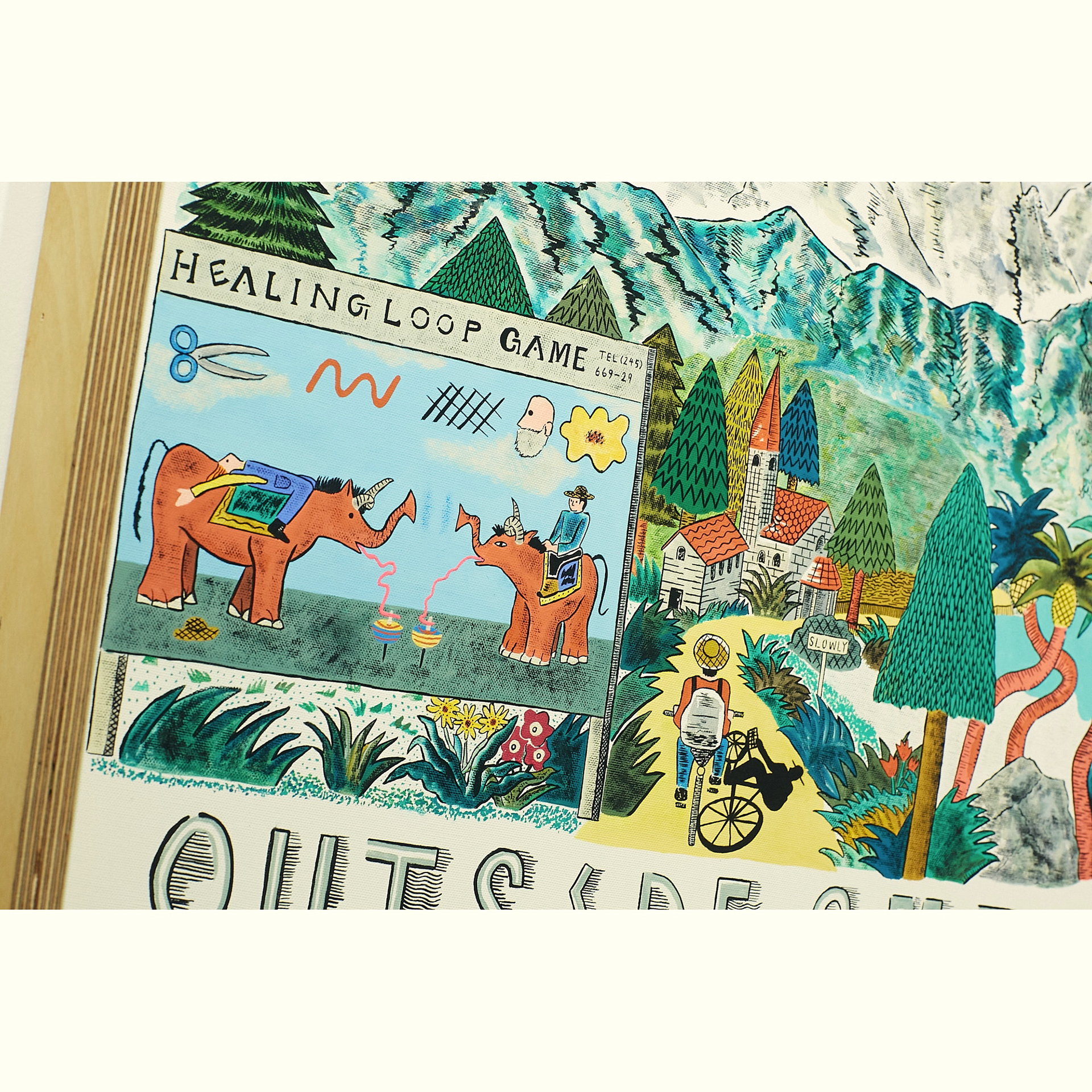 この展示の全体のテーマは、コロナ後の世界で生きる自分にとっての癒しとは外に出て感じる豊かな感情ではないかと考え、どこかの怪しい田舎の村に自転車で入る青年の小さな旅の物語の様なものを想像して絵を描いた。