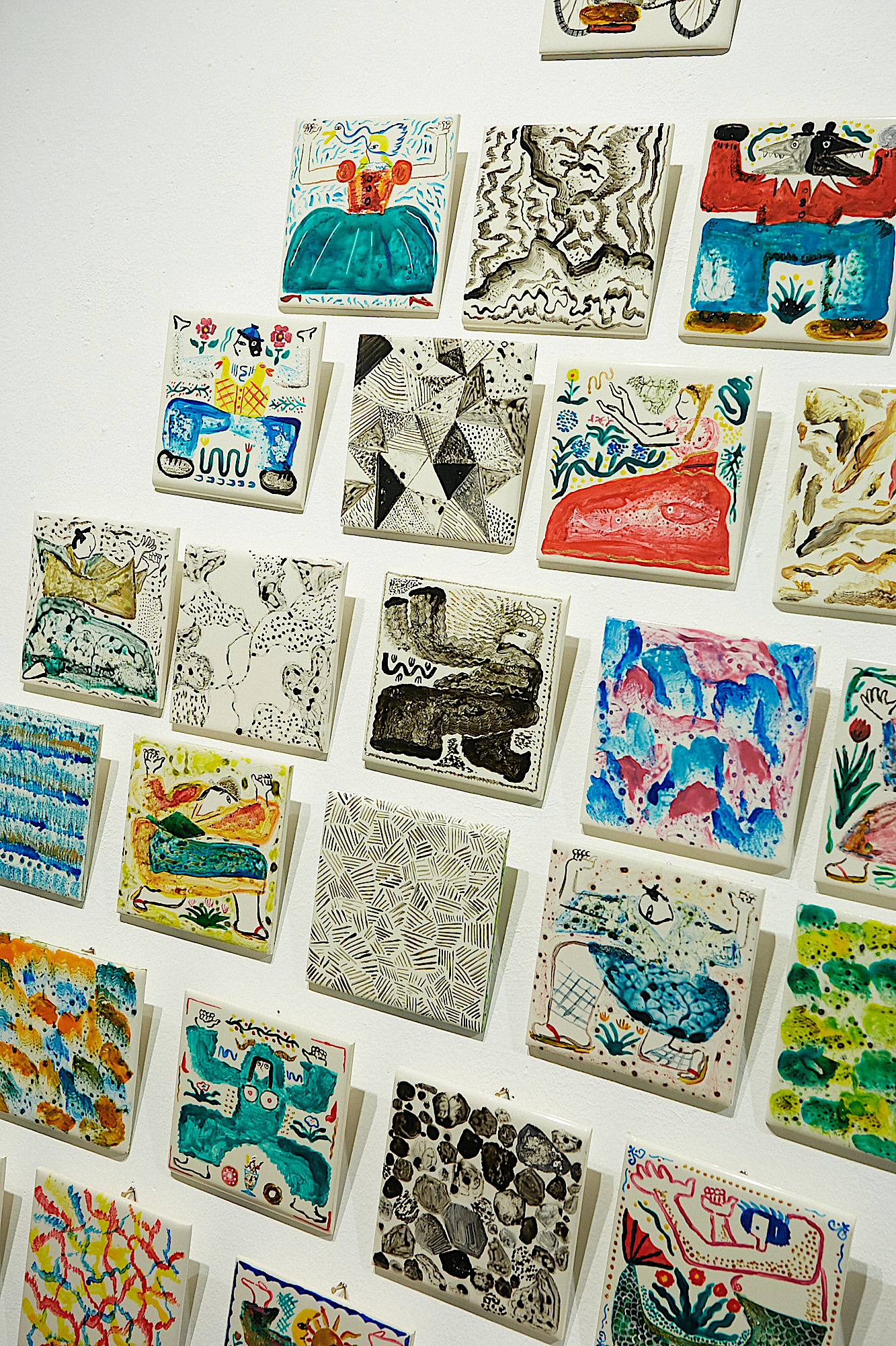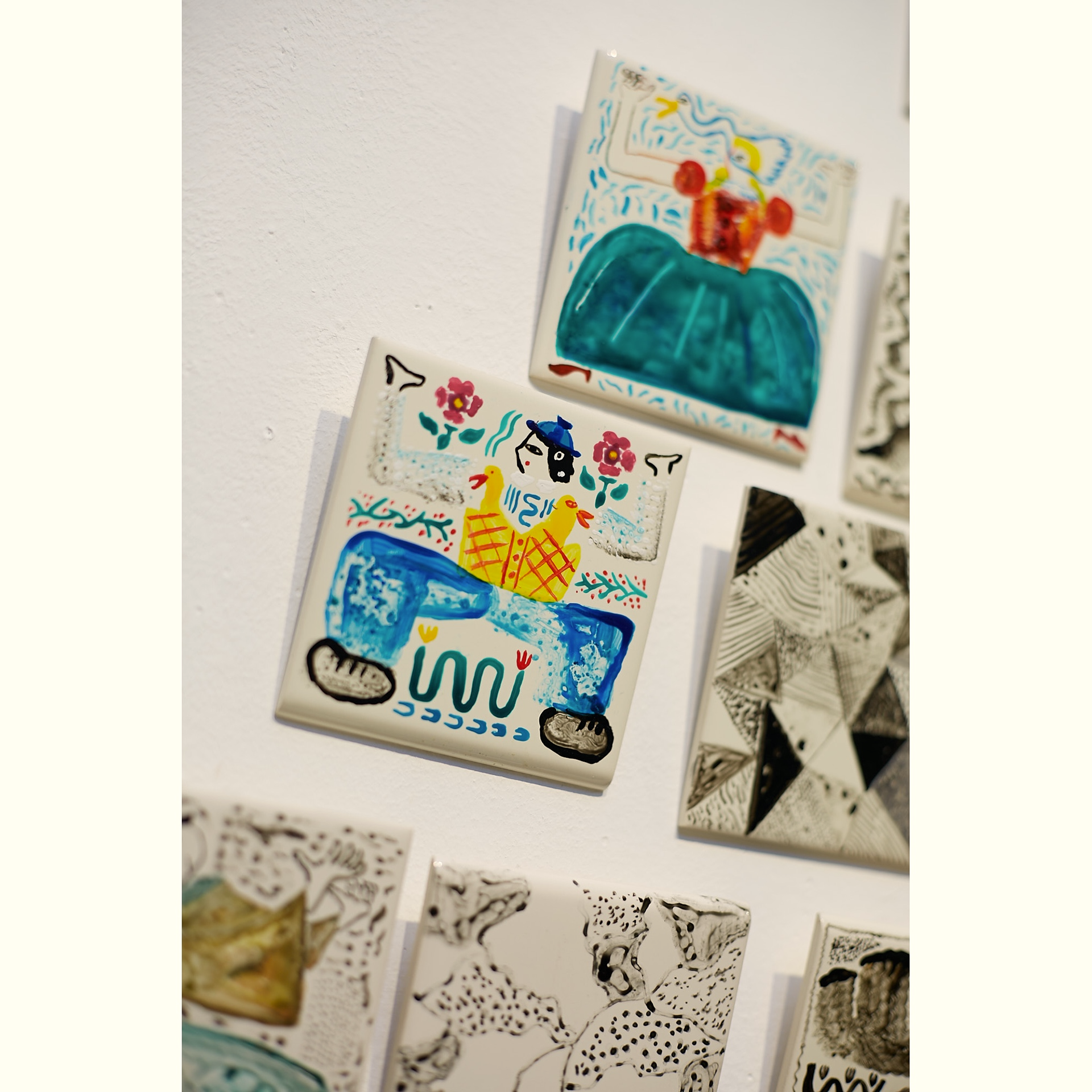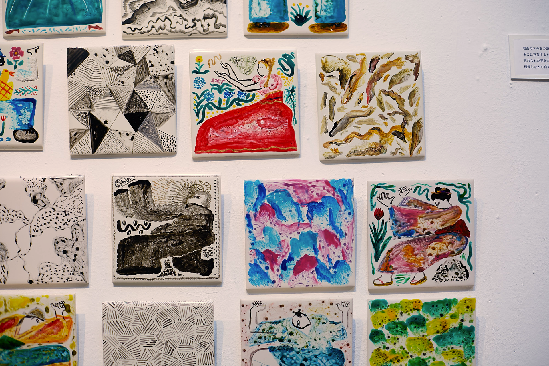 In addition to works on canvas, he also created several works on tiles. This one, titled "Strata Textures and the Forgotten Dead," exhibited the tiles as a single assemblage.