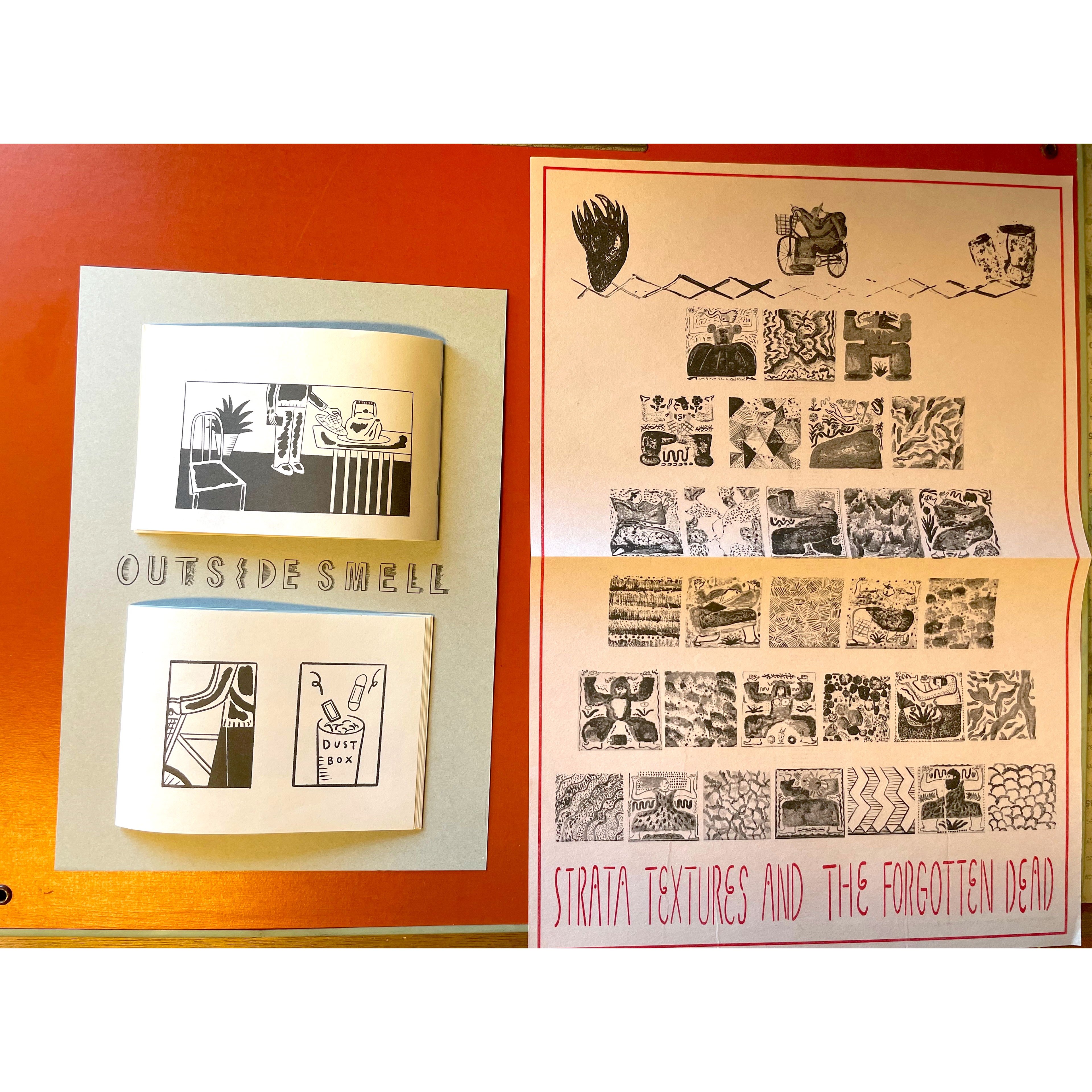 The "outside smell zine" created for this exhibition is a strange binding, in which the drawings are re-painted in risograph format, and the left and right facing pages are divided into top and bottom pages, making it more like a mysterious travel story. The QR code is attached to this zine so that the sounds can also be listened to.