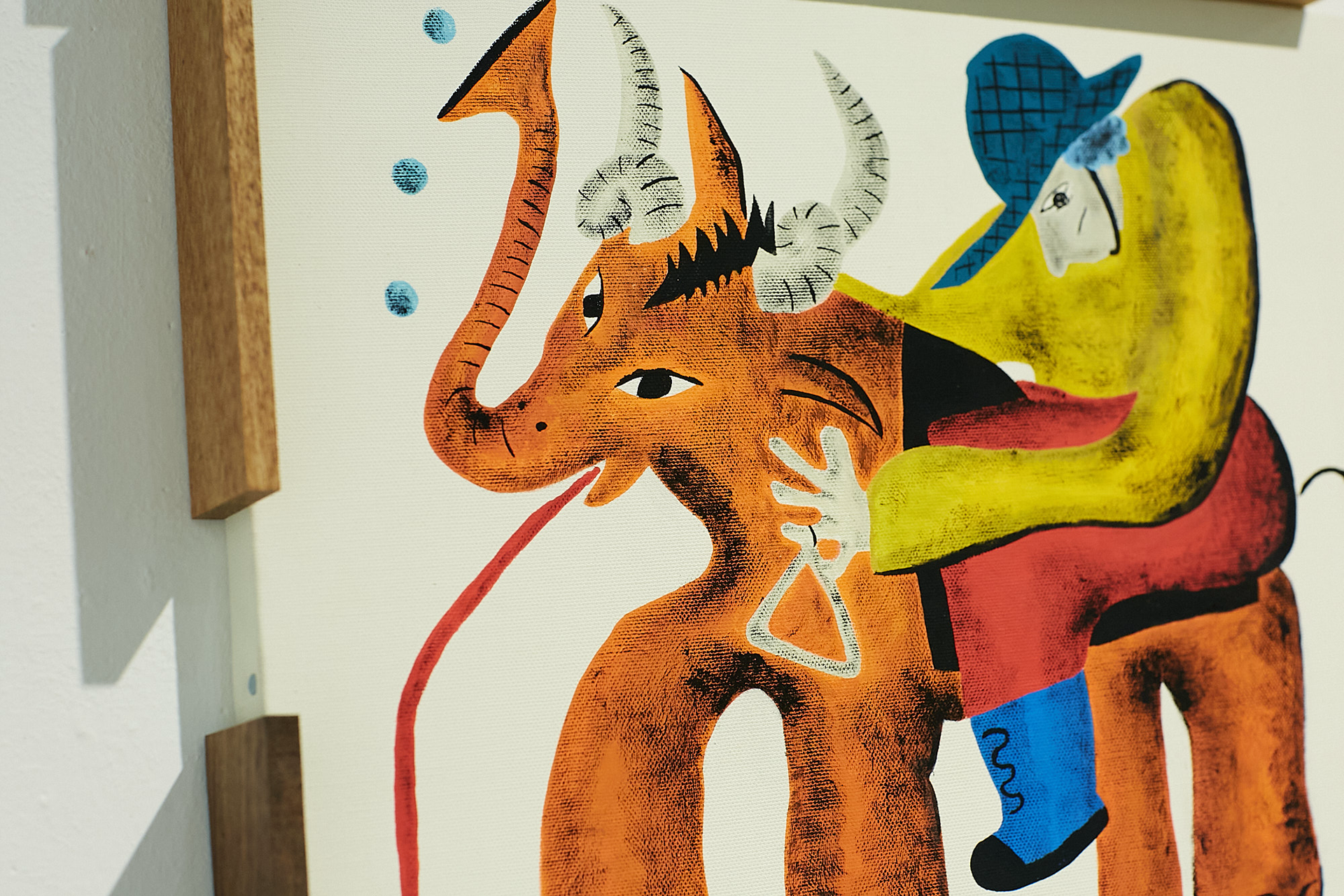 In this solo exhibition, I painted on canvas with acrylic paint, and used nail tackers to nail scrap wood with various cross-sectional patterns to the edges of the canvas.